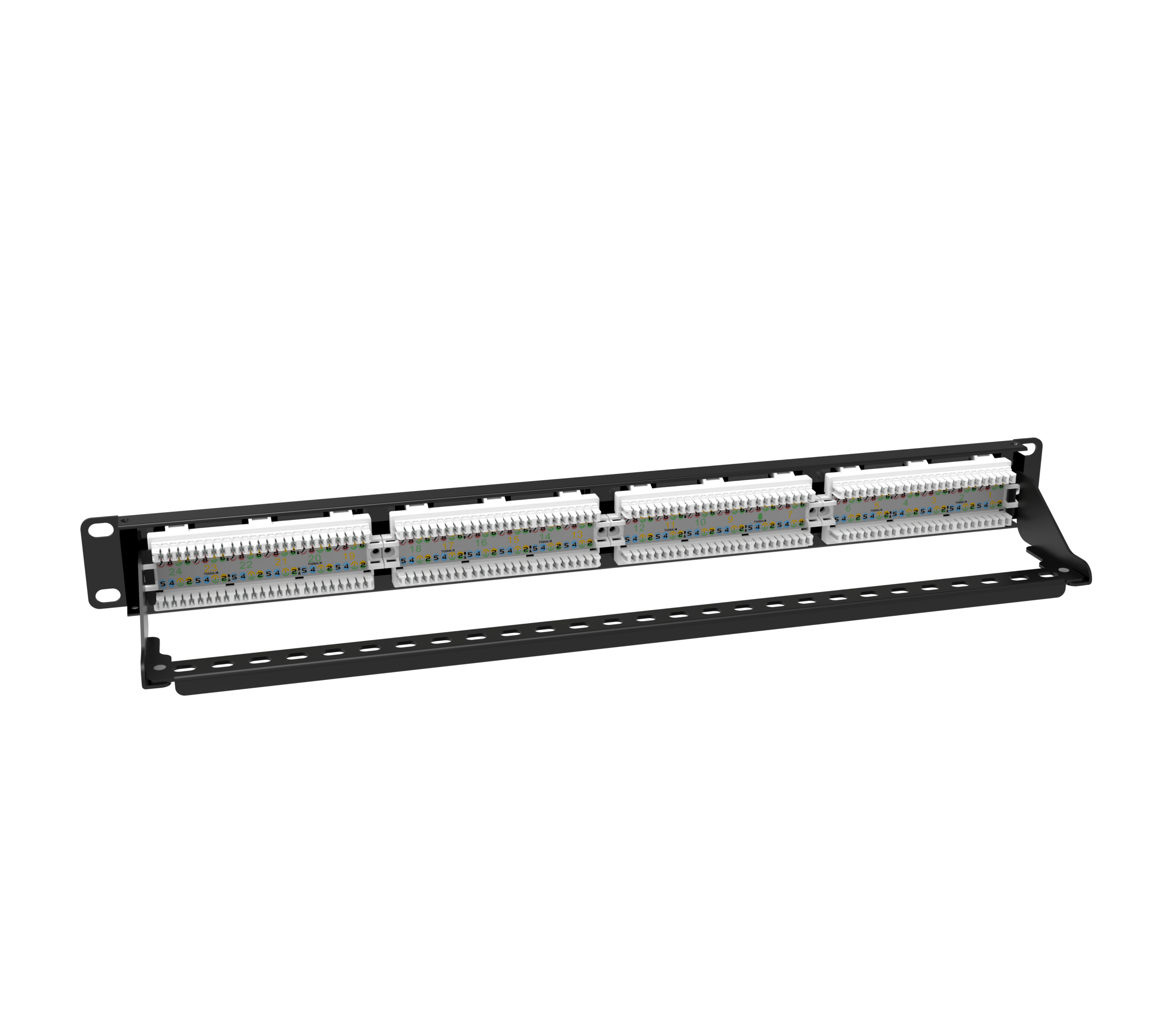 High-performance 24-port Cat6 unshielded patch panel with universal TIA wiring support, forward extraction design, and standard 1U rack height — perfect for organizing network cabling in server racks, data centers, or office LANs.